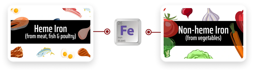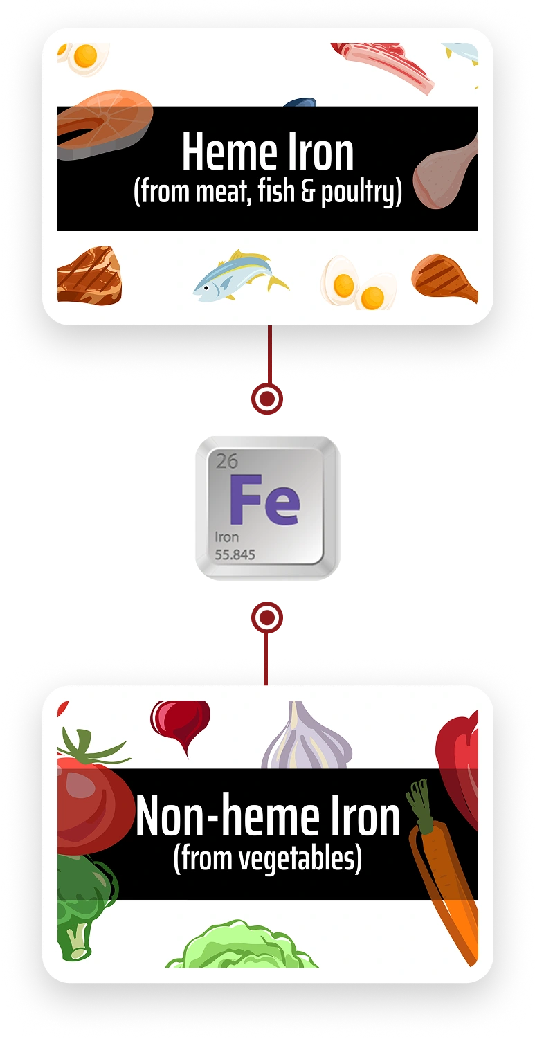 Enhanced iron absorption is possible when two different forms of iron – heme and non-heme – are taken together. These two types of iron may be absorbed through different mechanisms in the small intestine, enabling maximum absorption of iron, thus helping replete iron stores and restore energy in iron deficient people.