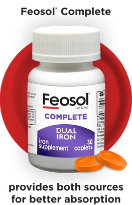 The two forms of iron found in Feosol® Complete iron caplets – heme and non-heme (also known as HIP and PIC iron) – work together to enhance iron absorption in your body while minimizing common GI side effects, such as nausea and constipation. That means your body gets the iron that it needs, but it’s gentle on the stomach.